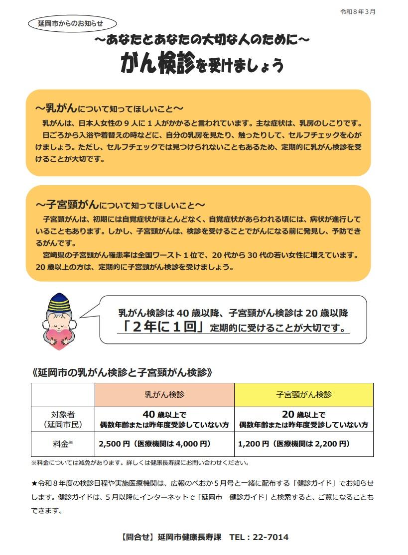 令和8年度の検診申込みは5月から開始いたします。詳細は、広報のべおか5月号と一緒に配布される「検診ガイド」をご覧ください。